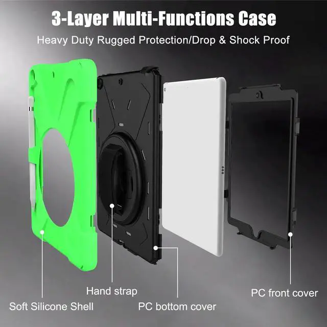 Highlights: Designed exclusively for the iPad 7th Generation 10.2" 2019, model for A2197/A2198/A2200 Precise cut allows full access to all ports, functions and buttons. Built-in Kickstand for the convenience of watching videos and chatting You can carry tablet with should belt and even hang it on your car seat. You can also hang it in other place you need, such as kitchen or bedroom. Inner hard polycarbonate clamshell with external soft silicone cushion coating to offer max protection and optimum comfortable grip. With built-in elastic pencil holder makes it easy to pull out and store your Apple pencil.