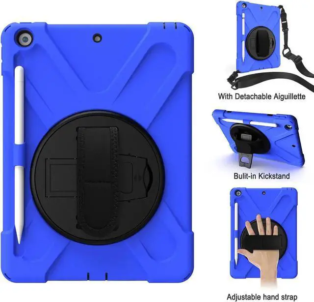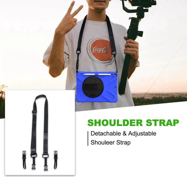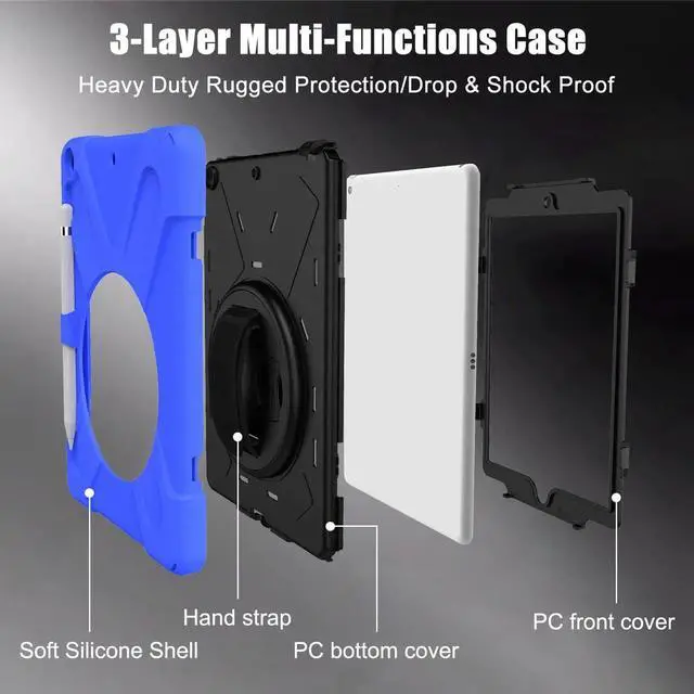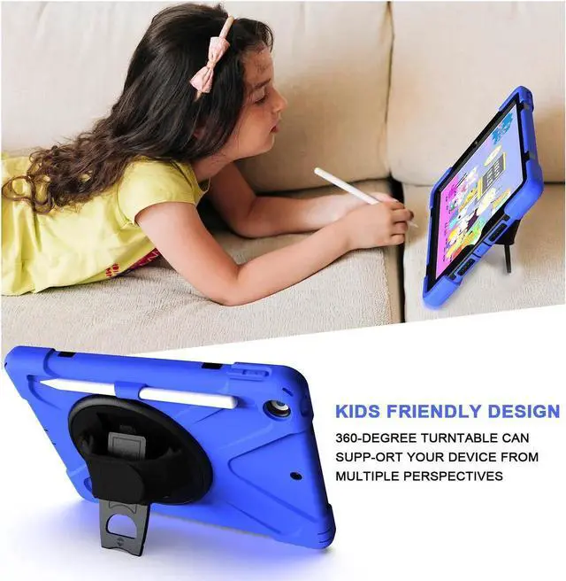 Tablet below: iPad 5th Gen (2017) A1822/A1823 iPad 6th Gen (2018) A1954/A1893 iPad 1, 2, 3 or 4 iPad Pro 10.5 inch iPad Pro 11inch iPad Pro 12.9 inch Any iPad mini Excellent Material for iPad case The case consists durable flexible rubber-like silicone outer frame and 2 pieces combination of hard reinforced inner shell to protects your iPad 10.2 against scratches. We use excellent material. Infinite viewing angles Infinite viewing angles. Vertical? Horizontal? Halfway between? There are no limits, here. Place your iPad at any angle you want. Whether you're reading, typing, or just binging on your favorite TV show, our 10.2 -inch iPad case's adjustable stand does it all. Adjustable Hand-strap Whether it is a child or an adult, you can adjust the tightness of the strap so that users comfortable to master their own tablet. The hand strap can also rotate along with the turntable in the middle. Break-proof design Equipped with flexible rubber-like silicone outer frame and four thicker round corners. It keeps your iPad secure and protect it from bumps, drops, and spills. Shatter- resistance and shock-proof design will greatly enhance your sense of safety.
