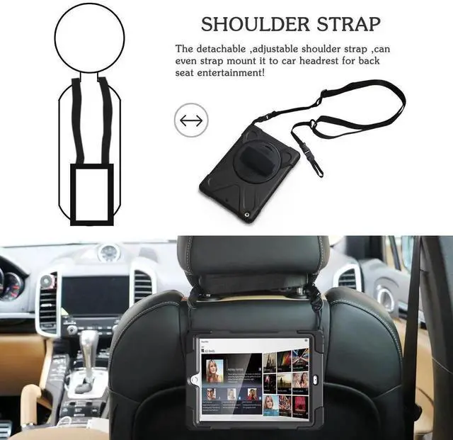 Adjustable removable shoulder straps . Attach strap to any two holes to carry your device vertically or horizontally like a messenger bag / neck bag / sling / harness or holster.allows you to display your tablet behind one seat for personal viewing or between two seats for shared viewing