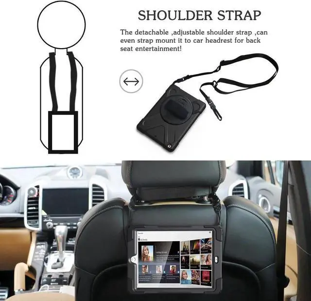 Adjustable removable shoulder straps . Attach strap to any two holes to carry your device vertically or horizontally like a messenger bag / neck bag / sling / harness or holster.allows you to display your tablet behind one seat for personal viewing or between two seats for shared viewing