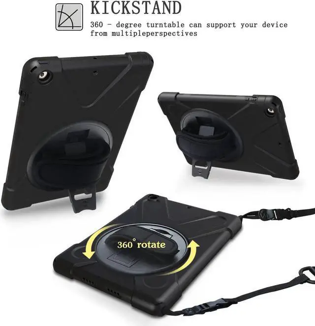 360 degrees rotatable kickstand & The adjustable hand strap mechanism for better experience with your iPad.Ideal for kids, students, teachers or anyone else who needs it for presentations, conferences and travelling.