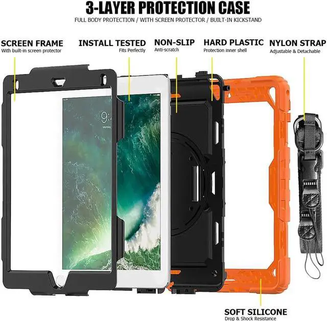 COMPATIBILITY: ONLY for New iPad 5th/6th Generation, as well as iPad Air 2 and iPad Pro 9.7. NOT fit other models. Please confirm the product before purchase. All in One 3 pieces combined installation, heavy duty full-body rugged case, with 360 rotating hand strap/portable shoulder strap, built-in kickstand, screen protector, and polycarbonate hard shell & silicone premium material. 360° Built-in Kickstand The built-in kickstand will set both hands free, whether you are watching video or playing games. 360° rotating Stand allows custome landscape or vertical viewing. Prevention of Drop Damages Effectively keeps iPad away from damages of dropping, bumps and shocks, its excellent safety performance will prolong the lifetime of the iPad 6th/5th. Adjustable/Detachable Shoulder/Hand Strap Adjustable/Detachable Shoulder Strap (total length: 172cm 67in) is more convenient for you to carry iPad. Easy to be attached and removed. With this strap, set your both hands free when you are working, playing game and on vacation, without the need of a purse, bag or backpack. It can hang from anywhere for better entertainment. It is also adjustable to fit with different occasions and for different people. The width is 2.5 cm (1in), which is comfortable when using it. Stylus Pencil Holder An extra Stylus Pencil Holder feature of this new generation case. Easily plug in/out, makes the pencil standing by your working. Unique Design to Protect iPad 6th/5th Better choice for your outdoor travelling, work and business. Create an ultimate protection for tablet, not only 360° Custome angles Hand Strap The adjustable/rotatable hand strap is made from premium soft fabric, fit for kids/adults, comfortable to hold th