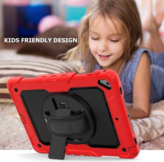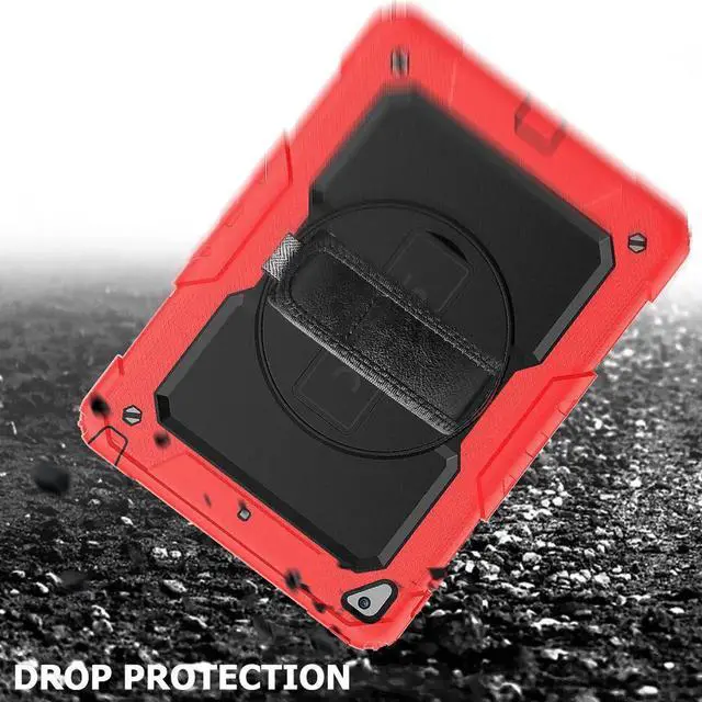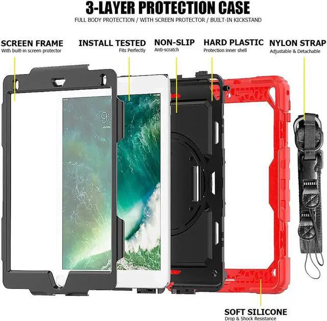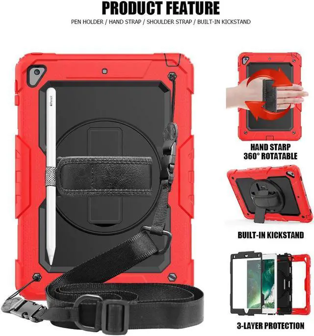 COMPATIBILITY: ONLY for New iPad 5th/6th Generation, as well as iPad Air 2 and iPad Pro 9.7. NOT fit other models. Please confirm the product before purchase. All in One 3 pieces combined installation, heavy duty full-body rugged case, with 360 rotating hand strap/portable shoulder strap, built-in kickstand, screen protector, and polycarbonate hard shell & silicone premium material. 360° Built-in Kickstand The built-in kickstand will set both hands free, whether you are watching video or playing games. 360° rotating Stand allows custome landscape or vertical viewing. Prevention of Drop Damages Effectively keeps iPad away from damages of dropping, bumps and shocks, its excellent safety performance will prolong the lifetime of the iPad 6th/5th. Adjustable/Detachable Shoulder/Hand Strap Adjustable/Detachable Shoulder Strap (total length: 172cm 67in) is more convenient for you to carry iPad. Easy to be attached and removed. With this strap, set your both hands free when you are working, playing game and on vacation, without the need of a purse, bag or backpack. It can hang from anywhere for better entertainment. It is also adjustable to fit with different occasions and for different people. The width is 2.5 cm (1in), which is comfortable when using it. Stylus Pencil Holder An extra Stylus Pencil Holder feature of this new generation case. Easily plug in/out, makes the pencil standing by your working. Unique Design to Protect iPad 6th/5th Better choice for your outdoor travelling, work and business. Create an ultimate protection for tablet, not only 360° Custome angles Hand Strap The adjustable/rotatable hand strap is made from premium soft fabric, fit for kids/adults, comfortable to hold th