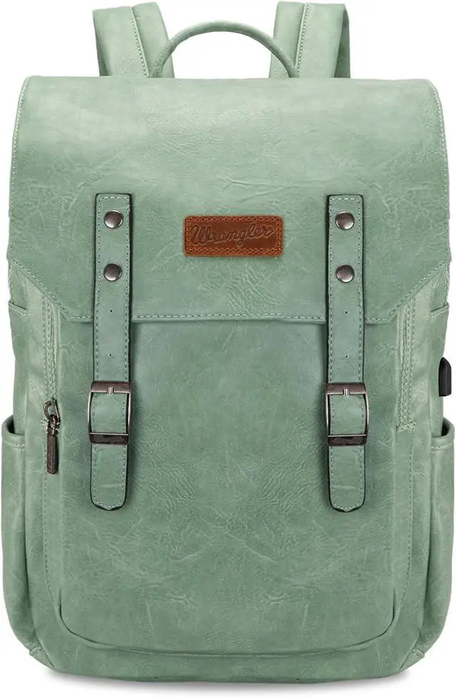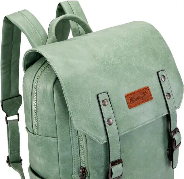 This unisex Wrangler vegan leather backpack features the classic Wrangler leather patch and gunmetal hardware, made of high-quality PU leather for long-lasting durability.