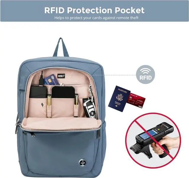 STYLISH PROTECTION Women backpack made with high quality materials and Swiss Design to provide both style and protection for your belongings. The velvet lined sunglass pocket gives your sunglasses comfort and protection. An RFID pocket protects your credit cards, driver' s licenese and passport from electronic snooping