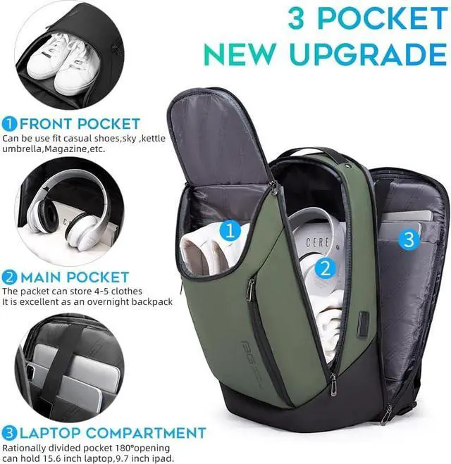 180° opening pocket: The front pocket can be use fit casual shoes, sky, kettle, umbrella, Magazine and Other goods, the backpack have 5 pocket, the main pocket can contain 4-5 chothesthe laptop pocket can 180°opening can hold 15.6 inch laptop and the pocket division reasonable can meet your daily needs, Two front pocket can meet your daily needs, You can place anything you have to have any items, such as wallet, pen, convenient sign, etc