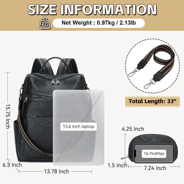 Multiple Compartments & Anti-theft Pockets DesignThe leather backpack for women features a large vertical opening at the top for quick access &loading items. Women's leather backpack has 1 main compartment with 2 zipper pockets, 2 slot pockets, 2 front pockets, 2 side pockets( can hold about 42 oz water cups), and 1 back zipper pocket. Multiple pockets can keep your items well organized. Moreover, comes with a pencil case allow you to carry some pens, phone cable,cash and small items.