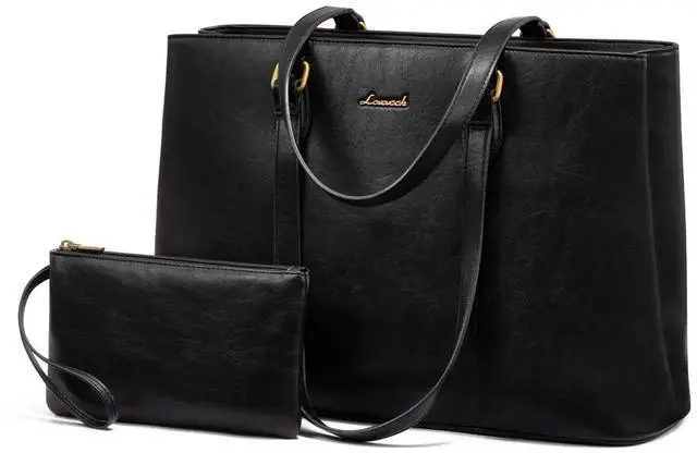 LOVEVOOK Laptop Bag for Women, 15.6 Inch Waterproof Vintage PU Leather Tote Bag with Wristlet, Professional Computer Briefcase for Teacher, Work, Daily (Black)