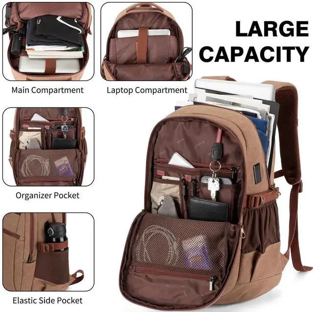 Tzowla Vintage Canvas Laptop Backpack for Men and Women, College Travel Work Rucksack with USB/Type-C Charging Port, Lightweight Bookbag Hiking Casual Daypack Backpacks Fit 15.6 Inch Notebook (Brown)
