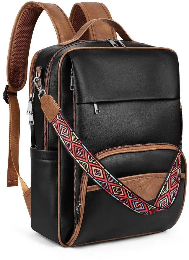 SYTRAH Leather Laptop Backpack, 15.6 Inch Business Computer Bag, Designer College Backpack Travel Backpack with Colorful Shoulder Bag Strap Black Brown