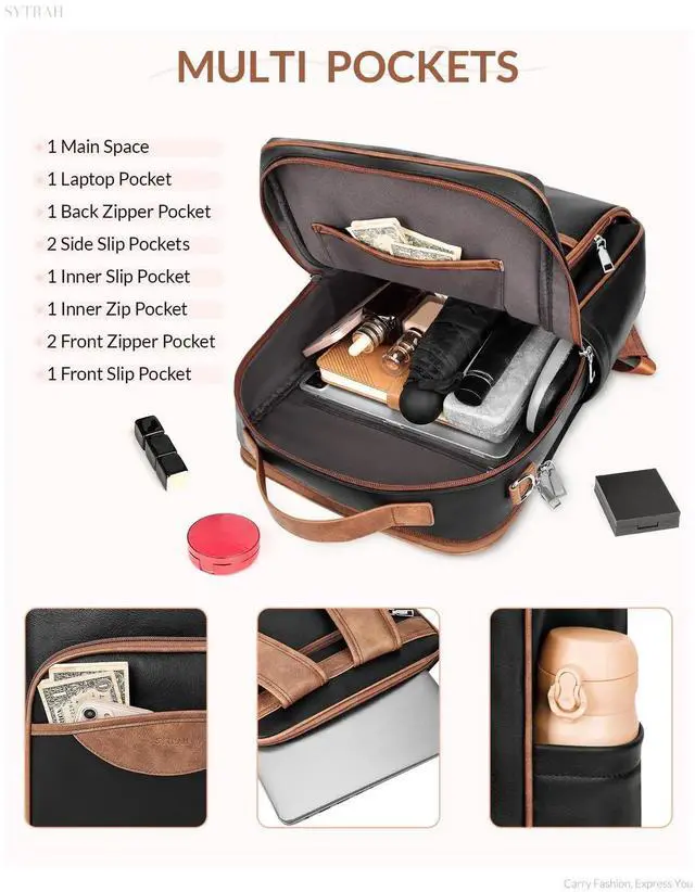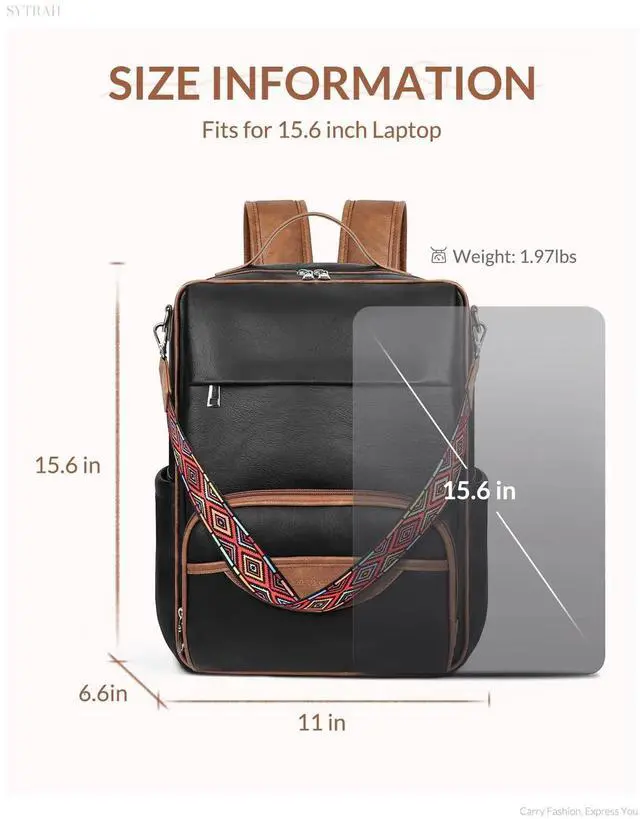 [Sleek & Secure Laptop Backpack] - Measuring 15.6 x11 x6.6 inches (39 x 27 x 16cm) and weighing 1.97 lbs. The SYTRAH 15.6 leather backpack for women is built for those who need serious storage without compromising style. Made from soft yet durable PU leather, this leather laptop bag features a fixed-length 24" colorful strap for a trendy shoulder bag look, plus a laptop bag with luggage sleeve for seamless travel.