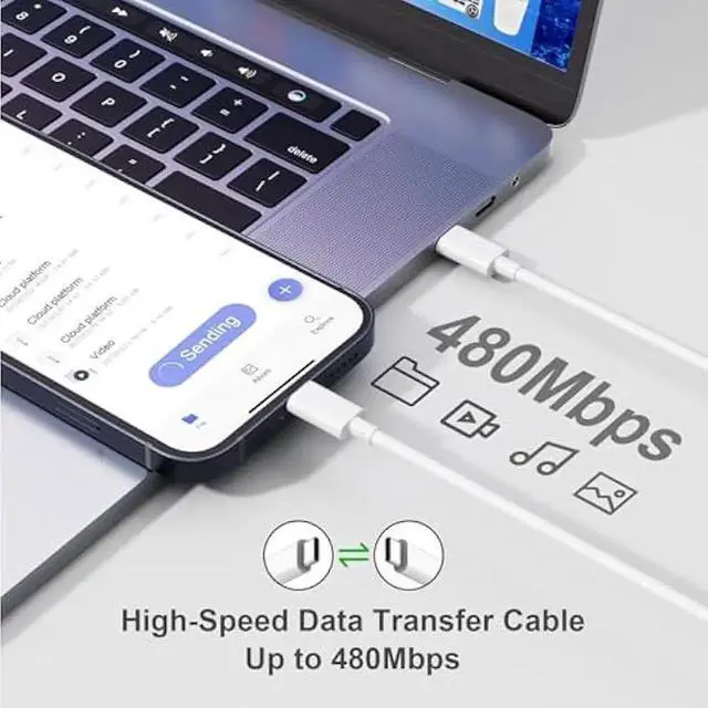 6.6 Feet USB C to USB C Cable By MFi Certification The 6.6 Ft Macbook Cable Protects your Device Charging Port From Damage, is Made of Super Thick Copper Wire Coated With Premium Soft Touch TPE, and is Flex Tested over 30, 000 times to Provide up to 4x the Lifespan, so you Can Charge and Entertain Wherever you go, and Supports 480Mbps Data Sync Between Your Laptop