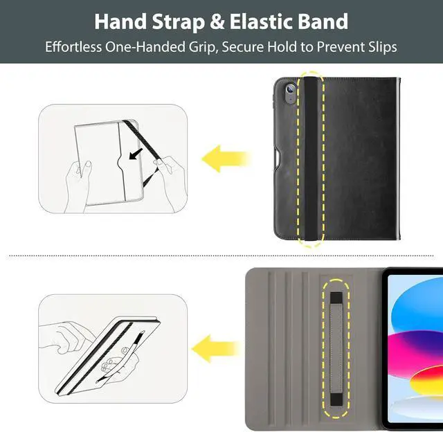 Hand Strap: Multiple slots able to set up multiple horizontal stand angles for watching or typing. Elastic hand strap enable you to hold your tablet safely with only one hand while using it for everything elseFront