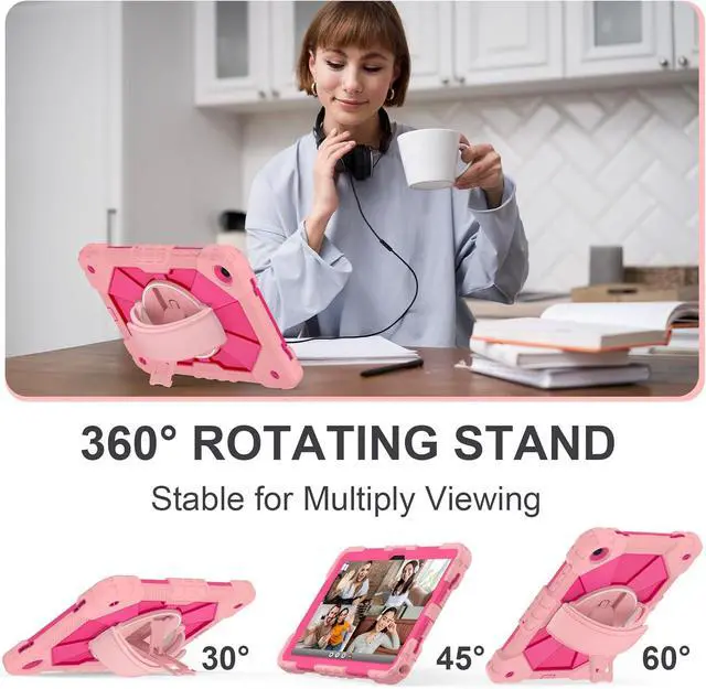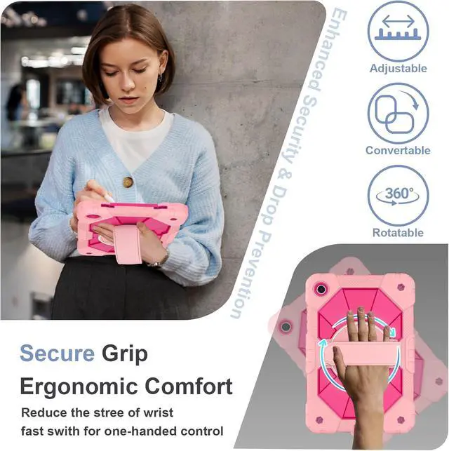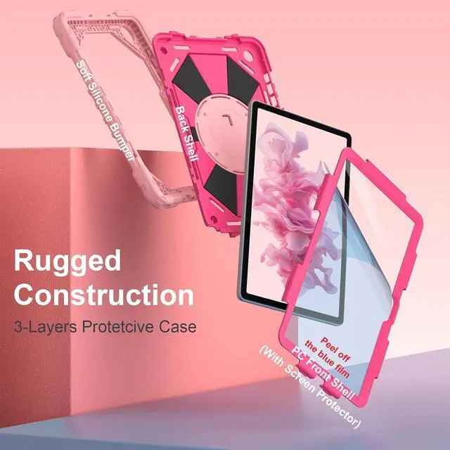 The 360° rotatable hand strap provides a firm grip for extended use allowing you to switch between portrait and landscape orientations instantlywithout straining your wrist. Engineered for teachers technicians and workers who require mobility on-the-go data entry managing digital resources or presenting materials while walkingHeavy-Duty DefenseEngineered for max durability this Galaxy A11+/A9+ case features a robust 3-layer defense system. A rigid inner shell maintains structural integrity while a shock-absorbent silicone bumper disperses vibrations from impacts and falls. Effectively guards your A11+ tablet against accidental slips drops and daily wear. Includes a built-in screen protect to keep your display pristine please PEEL OFF the blue protective film before useCarry It Your Way Comes with a detachable adjustable Shoulder Strap.