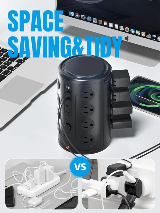 Product Description: The Power Strip Tower Surge Protector by UWIWUTEI provides a convenient and efficient solution for powering multiple devices simultaneously. With its space-saving design, it optimizes your workspace and keeps your cables organized. Featuring 16 AC sockets, it offers ample outlets for your devices while ensuring safety with 10A overload protection. The 3X1.5 square meters power cord, along with the built-in short-circuit fuse, guarantees stable and secure power supply. In addition to the AC sockets, this power strip tower is equipped with 2 type-C ports and 3 USB ports, enabling you to charge various devices at once with a total output of 3.4A. With built-in lightning protection, your devices are shielded from voltage spikes and surges. The power strip tower also supports wireless charging with a fast charging power of 15W, bringing convenience to your charging experience. Whether you're at home, in the office, or on the go, this power strip tower is an ideal choice for tech enthusiasts, professionals, students, and anyone in need of multiple power outlets