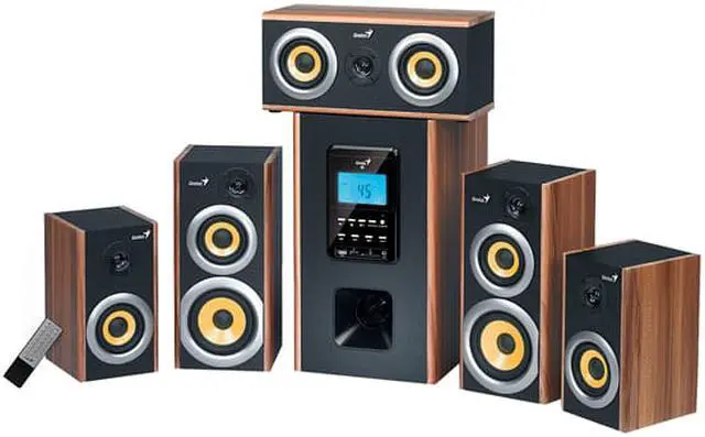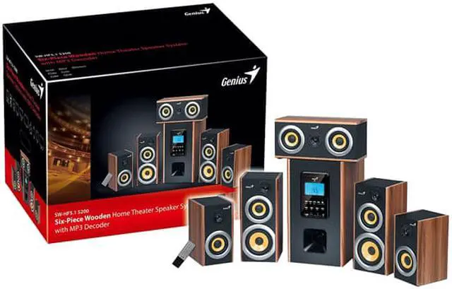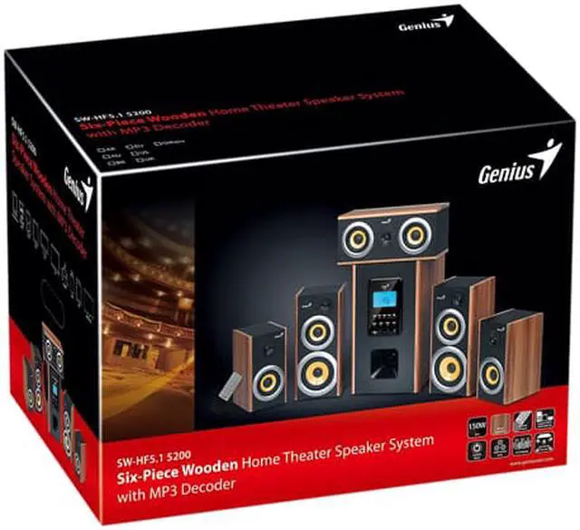Enjoy a home theater experience or exciting games with the Genius six-piece SW-HF5.1 5200 Surround Sound System. With the 150-Watt Hi-Fi speaker system, you experience all-in-one surround sound in a very solid, elegant, wood design home theater system.