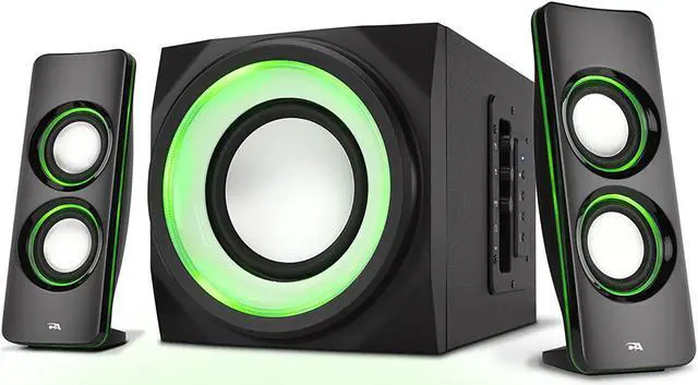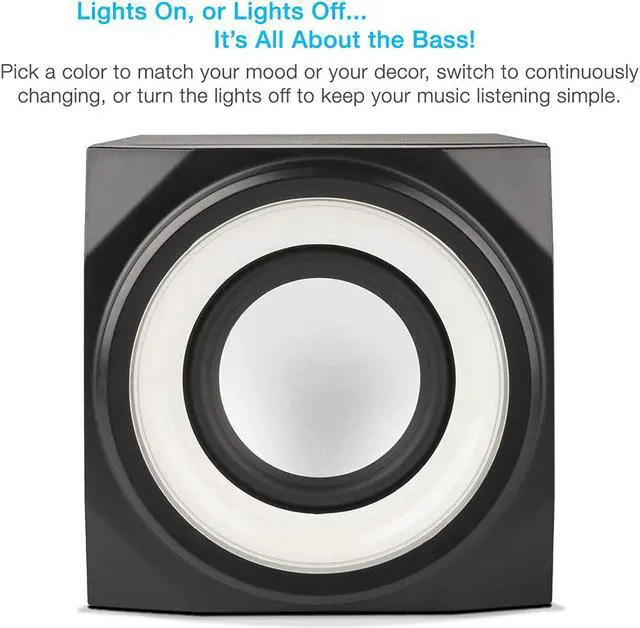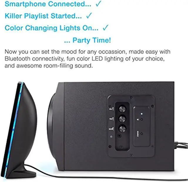 The “Curve. Lights” speaker and subwoofer system makes for the perfect party, with color changing LED lights to set just the right mood. Great for enhancing games, music and movies – particularly in the dark. Bluetooth capability gives you spontaneous ability to connect and play / control the music from anywhere in the room. With an LED color changing speaker, great for parties, dorm rooms, small home theater living rooms, or to match the lighting on your gaming computer system. Use with iPods, music players, DVD players, smartphones, tablets, laptops/notebooks, PC computers, Macs, game consoles and even TV entertainment systems.