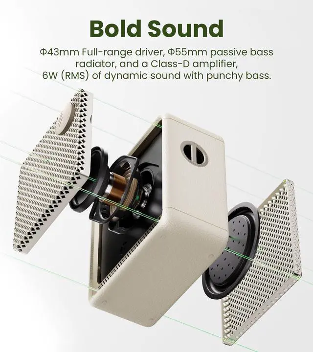 Elevate your listening experience with this speaker, a compact but powerful Bluetooth speaker designed for music lovers on the go. Featuring 6W (RMS) output power and a 1.7 '' (43mm) full-range driver with 2'' (55mm) passive bass radiators, it offers rich and punchy sound with deep lows and crisp highs. Enjoy seamless wireless connectivity and the ability to pair two speakers with Bluetooth V 5.4. Its IP67 waterproof and dustproof makes it the perfect companion for outdoor adventures, and 12 hours of battery life ensures your music never stops.