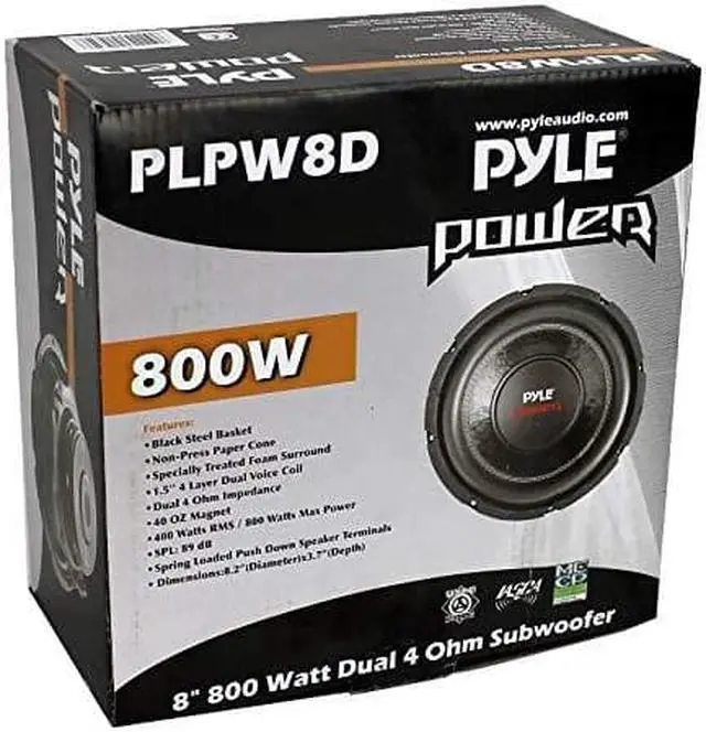 **Package Includes:**andlt;brandgt; 2 x Pyle PLPW8D 8" 800W 4 Ohm Car Subwoofer The PYLE **PLPW8D** 8" 800W Dual Voice Coil 4 Ohm Car Audio Subwoofer can handle 800 Watts of MAX power! It features Specially Treated Foam Surround, Non Press Paper Cone, and a Black Steel Basket. Give your car audio system serious BASS with the PYLE **PLPW8D** 8" 800W Dual Voice Coil 4 Ohm Car Audio Subwoofer 1 buy = 2 subwoofers **We are an Authorized PYLE Dealer**