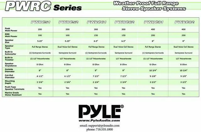 Size:8-Inch andnbsp;|andnbsp; Style:2 Speakers PyleHome Model : PWRC818'' In-Wall / In-Ceiling Speakers8” Weather Proof 2-Way In-Ceiling / In-Wall Stereo Speakers Features:8" Polypropylene Woofers with Santoporene SurroundMarine Grade ConstructionWeather Resistant for High Moisture Areas For Indoor and Outdoor UseConvenient Push-Type Speaker TerminalsIncludes Hardware and Cut-Out Template for Easy Installation Stain Resistant GrillTechnical Specs:400 Watt Peak Power Handling 200 Watt RMS Power½” Polycarbonate Tweeters8 Ohm ImpendenceFrequency Response: 55Hz-22kHz Outside Diameter: 10 3/4” Cut Out Diameter: 9 3/8” Mounting Depth: 3 2/3”The Pyle PWRC81 speaker system delivers stereo sound to any room in your home or office without cluttering floor space. These 8” moisture-resistant speakers with marine grade construction can be placed indoors, outdoors or anywhere excessive moisture exposure is possible. The PWRC series speakers feature impressive power handling capability, heavy-duty voice coils and high-efficiency response rates – all to produce fuller and more rich sounds. Can be used for both in-ceiling and in-wall applications for a clean look. Convenient push-type speaker terminals allow for quick and hassle-free speaker wire connection. Kit includes mounting hardware and cut-out template for easy installation. Achieve optimal sound performance and enhance your overall audio experience with the Pyle PWRC Speaker Systems. Sold as pair.
