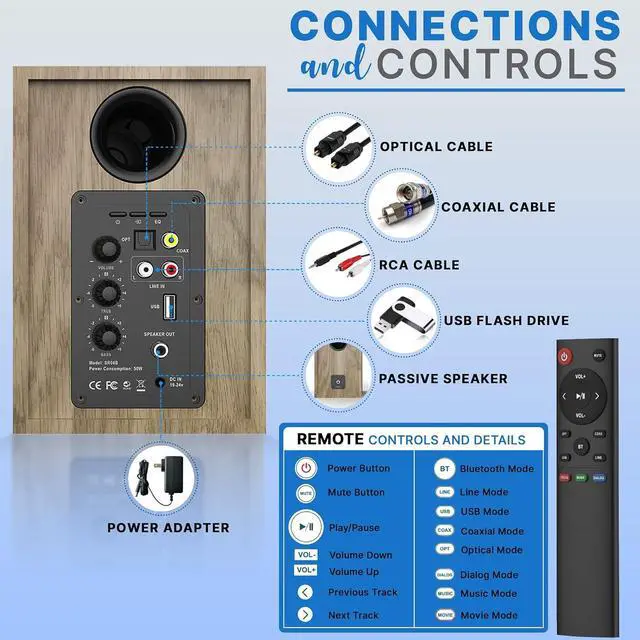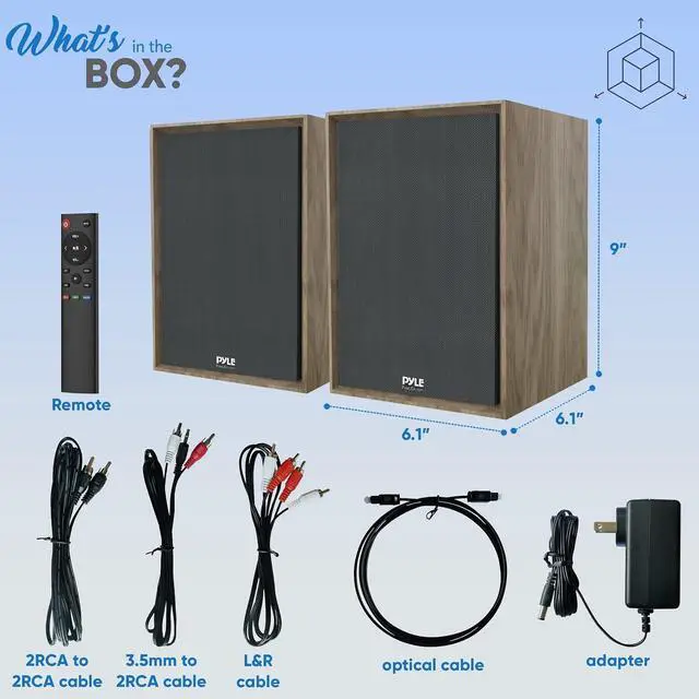 - INCLUDED ACCESSORIES: These Hi-Fi bookshelf monitor speakers dimensions are 6.1 x 6.1 x 9 inches each and come with (1) US adapter, (1) optical cable, (1) L&R connection