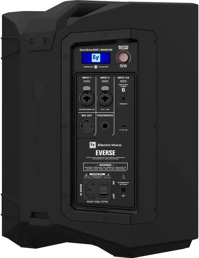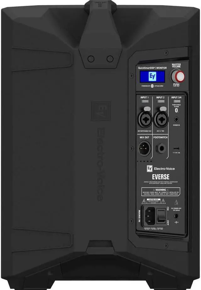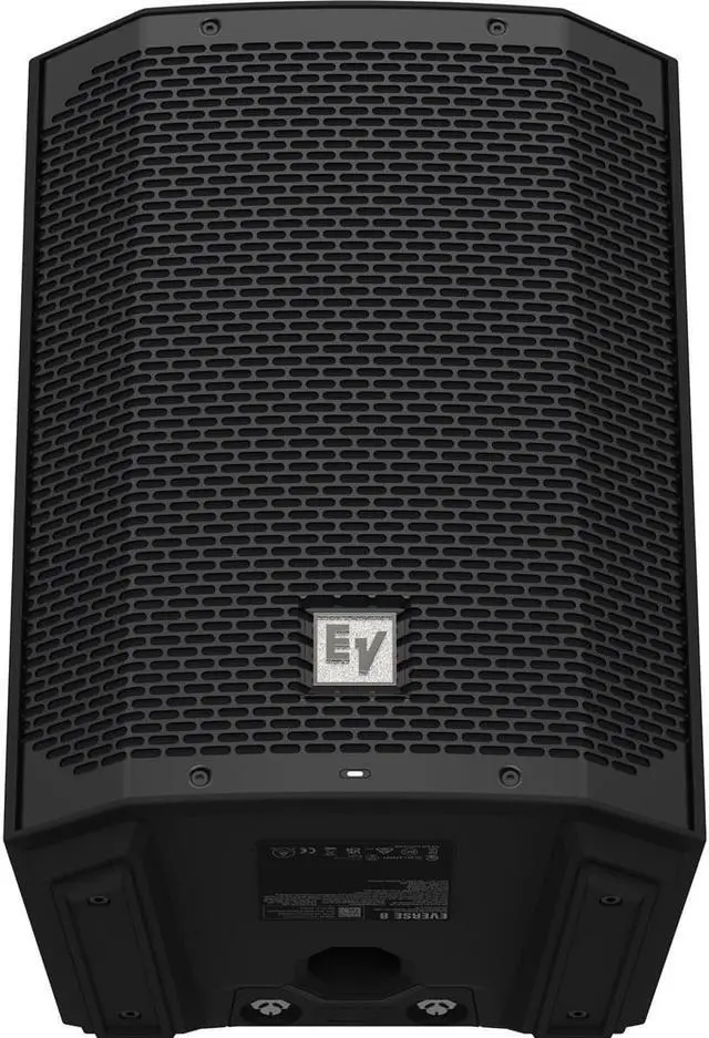 EVERSE 8 redefines portable PA with premium sound quality, user-friendly design, and rugged weather resistance. It features a high-output 8â?� woofer with EVâ??s patented SST port design and a 1â?� titanium dome tweeter on a custom waveguide for consistent 100º x 100º coverage and a max SPL of 121 dB. Its built-in high-efficiency Class D amplifier, co-developed with Dynacord, powers a 4-channel digital mixer with pro-grade DSP tools: 48V phantom power, studio-quality effects, ducking, feedback suppression, and more. Use the free EV QuickSmart Mobile app to control everything wirelessly from your phone or tablet. With an IP43 weatherized rating, the EVERSE 8 is protected against light rain and splashesâ??making it ideal for outdoor events, fitness classes, busking, and mobile performances. Multiple mounting angles and Bluetooth® true wireless stereo capabilities expand its flexibility even further. Add in an onboard USB charging port, 12V DC output for wireless mic systems, and compatibility with accessories like an equipment tray or tote bag, and the EVERSE 8 becomes an unbeatable grab-and-go sound solution. Model Features
