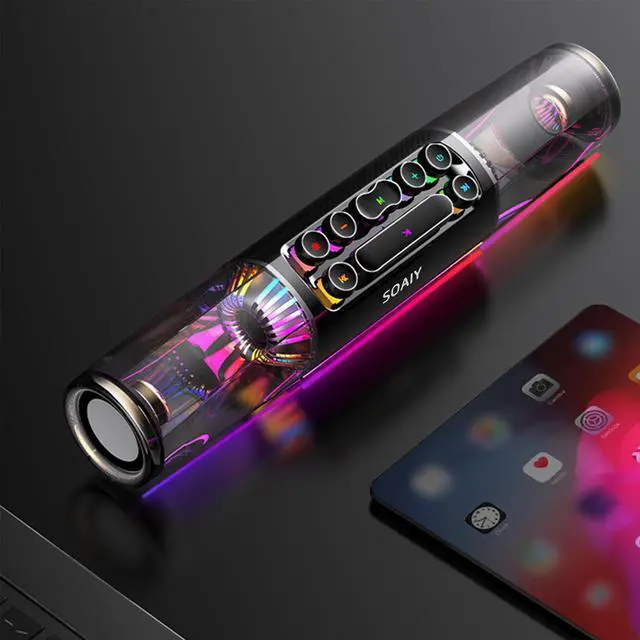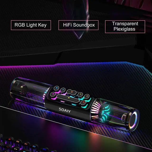 Features: Steady and HiFi bass sound effects and stereo surrounding sound loudspeakers bring you wonderful music. With USB/TF Card Slot/ 3.5 mm audio plug, it's perfect for desktop, laptop, TV, smartphone, tablet PC, MP3, MP4, and more. There are 8 retro mechanical buttons above the speaker to control RGB lighting effect, mode switching, music control, unique e-sports style. High-quality ABS-made material, translucent speaker body, with 16 RGB lighting effects, lighting changes, enhance the background atmosphere. Classical black appearance with dual 7.5W speakers, powered by DC12V/2A adapter, suitable for home use.
