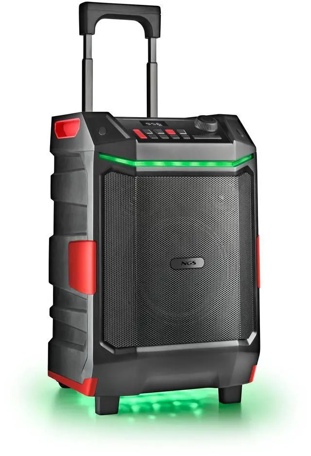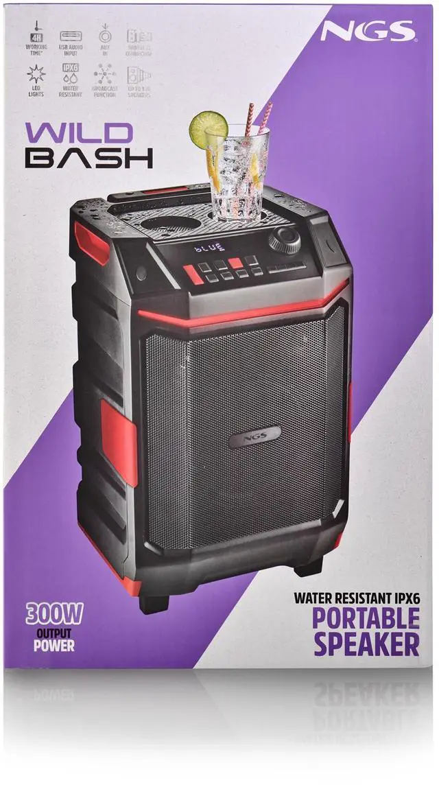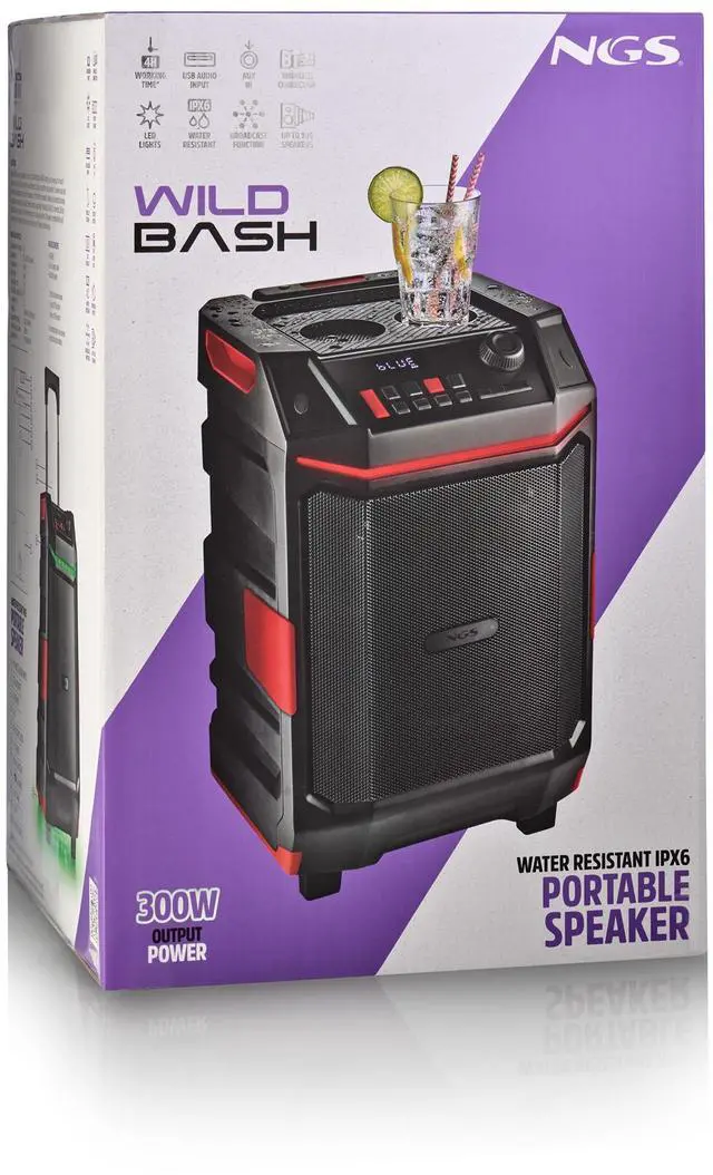 The NGS WILD BASH is a portable Bluetooth speaker designed to deliver powerful sound wherever you go. With 50W RMS output (300W peak), it provides clear and energetic audio both indoors and outdoors. Its compact trolley-style design with integrated wheels makes transportation effortless, while the rugged build ensures durability in all environments. The speaker also features RGB LED lighting to create a lively party atmosphere.