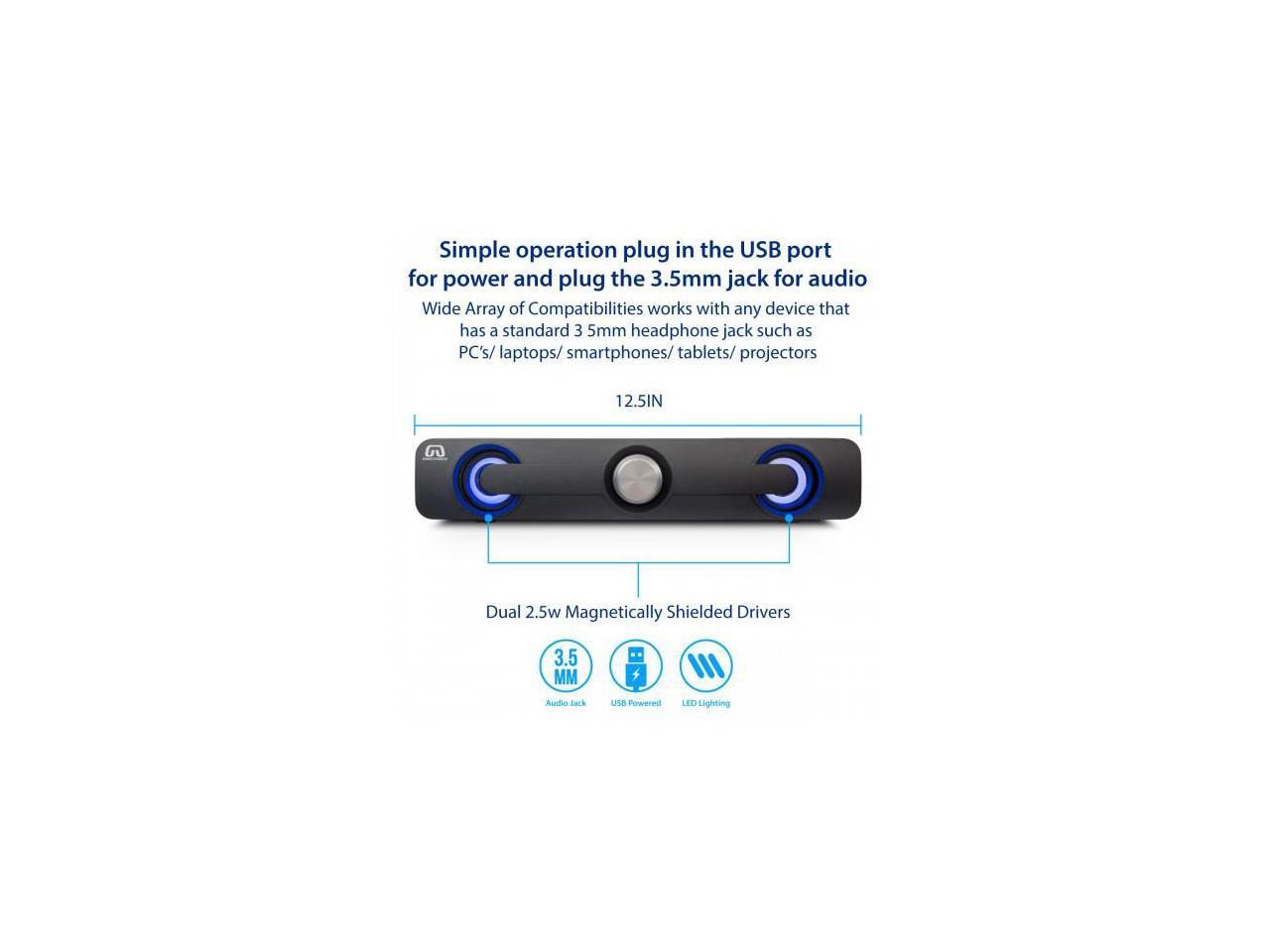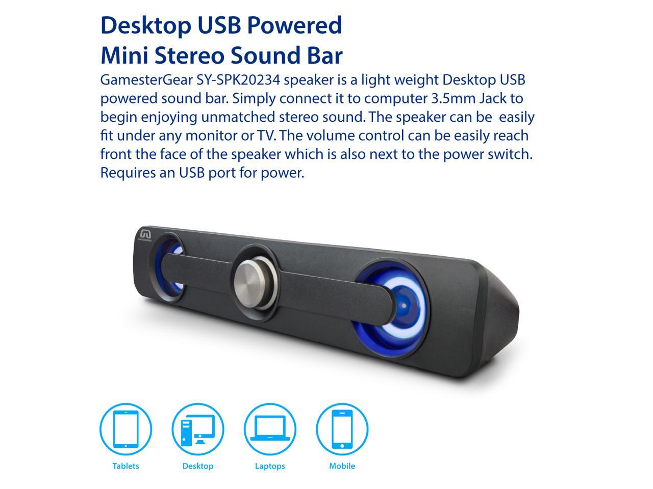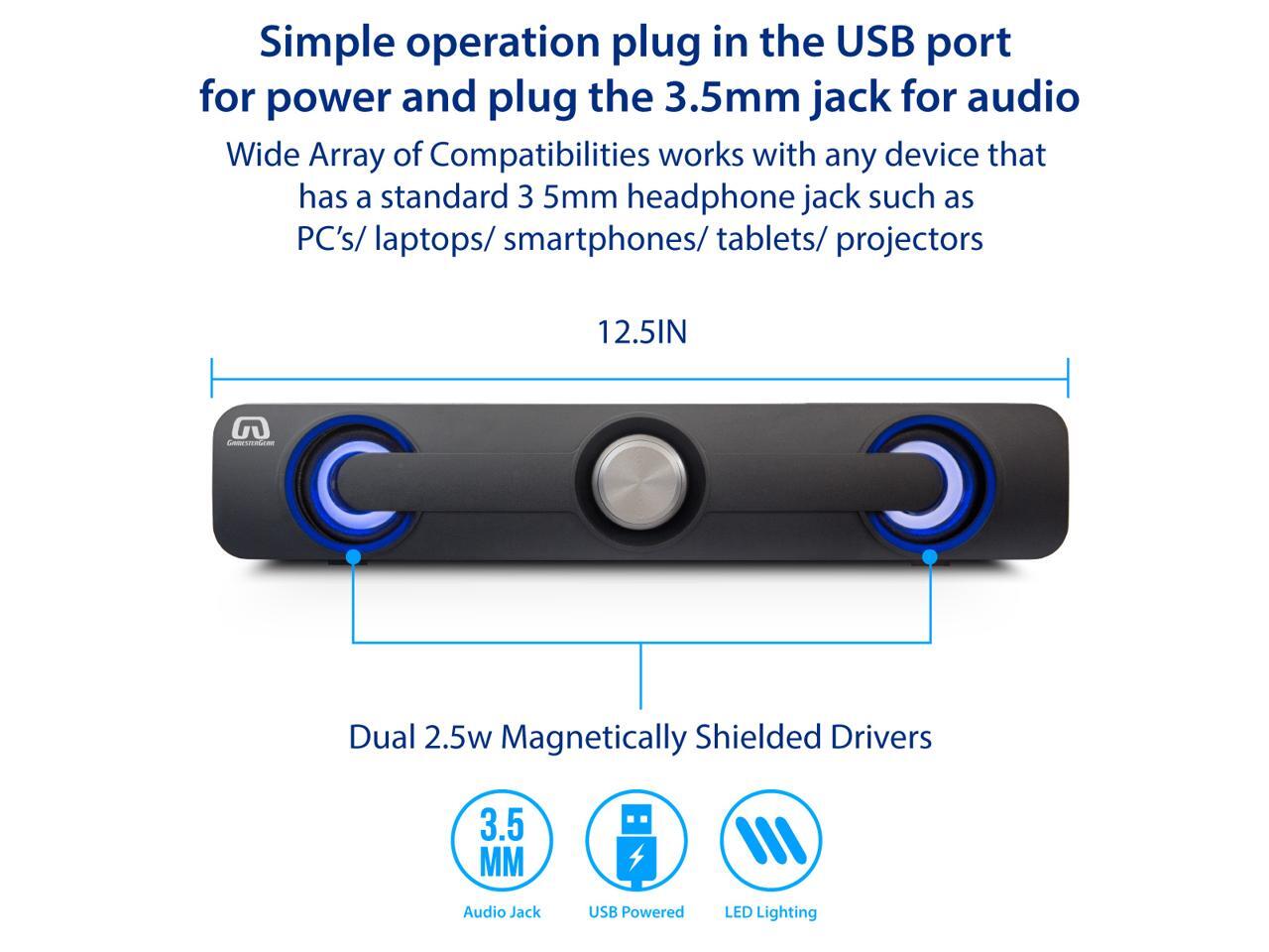 - The sound bar speaker is USB powered (5V), with 3.5mm plug, plug and play, no need extra software. Simply connect it to 5V power and 3.5mm plug to your devices, turn on the LED light, turn up the volume, and enjoy it.