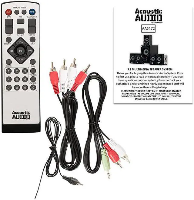 Color: Gray AA5172 Bluetooth 5. 1 Speaker SystemStream music from your phone to the built in Bluetooth ReceiverIntegrated Power Amplifier with 700 Watts System PowerPro Surround Function Automatically Converts Stereo to 5. 1 SoundEasy Plug and Play ConnectionsStandard RCA inputs connect to most audio sources6 Independent RCA Inputs for True SurroundStereo RCA AUX InputsIlluminated Display with Front Panel ControlsUSB Drive Input and SD Card InputFM TunerFull Function RemoteMagnetically Shielded Wired Satellite Speakers1 Powered Subwoofer Speaker is (H x W x D) 12. 3" x 6. 7" x 13. 1"Frequency Response is 20Hz-20 kHzEnhanced Bass Boost Ported Design5 Wired Satellite Speakers are (H x W x D) 6. 7" x 4. 1" x 4" each2 Front and 1 Center Satellite Speakers have 6 Foot Single RCA Cables2 Rear Speakers have 12 Foot Single RCA CablesSystem RequirementsStandard US 110V Grounded Wall PlugAny audio device with a standard 3. 5mm Headphone, RCA Stereo or RCA 6 Channel Surround Audio OutputsSearch AA5170D for this model with Smart TV Digital Optical InputApplicationsTV or Home Entertainment SystemLaptop or Personal ComputerDVD or MP3 PlayerCell Phone or TabletGamingWhat's in the box1 Powered Subwoofer Speaker5 Passive Wired Satellite SpeakersFull Function RemoteRCA Antenna Cable3. 5mm to RCA Cable2 RCA to RCA Jack CablesInstruction Manual