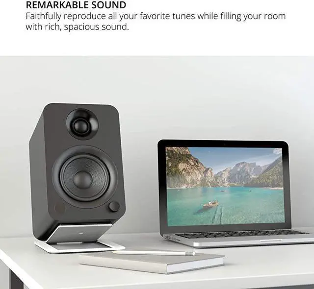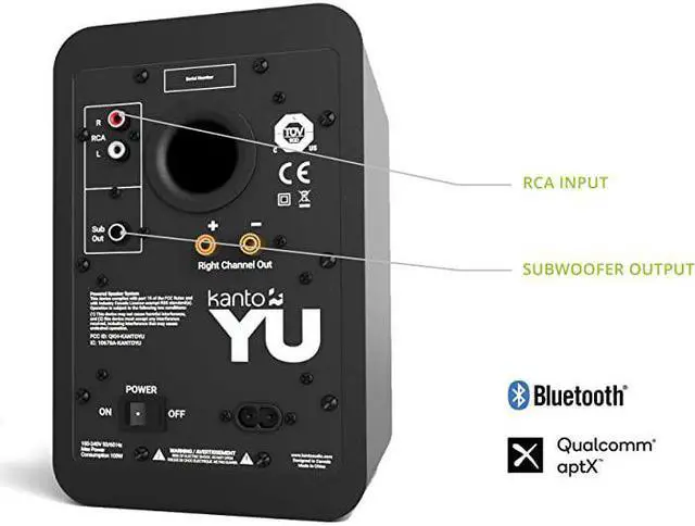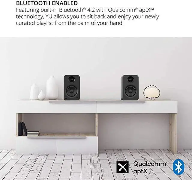 Keep things simple without forfeiting performance. Housed within YU's compact MDF cabinets is everything you need to get the most out of your favorite tunes. Bluetooth 4.2 with aptX provides highquality streaming, a single RCA input covers all your analog needs, and a SUB OUT port gives you the option to really crank up the bass. Equipped with 4inch Kevlar drivers and 1inch silk dome tweeters, this highperformance powered speaker system delivers smooth, natural sound while ensuring you experience the full impact of lower frequencies. For laidback listening, use the provided remote to make quick volume, tone and balance adjustments, as well as control playback while streaming via Bluetooth.