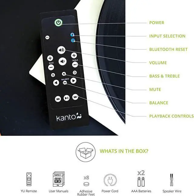 REMOTE CONTROL With volume, input, tone and balance controls, as well as playback options while using Bluetooth, the YU remote gives you full control over your audio. SIMPLE INTERFACE YU's userfriendly interface features a single knob. Simply rotate for volume, push in to switch between inputs, or push and hold to activate and deactivate standby mode. What's in the box? YU Powered Bookshelf SpeakersPower CableSpeaker WireRubber FeetRemote with 2-AAA BatteriesUser Manual