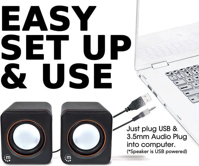 These two robust speakers are small in size but big on sound. They give you the options you need to position them around your PC or laptop to get the right sound that's best for you. They draw their power through their USB connection to your device so you don't have to worry about plugging in a power adapter or finding an open outlet. For more convenience, the speakers use the 3.5 mm plug that connects with many multimedia devices. You get the sound you need right where you need it.