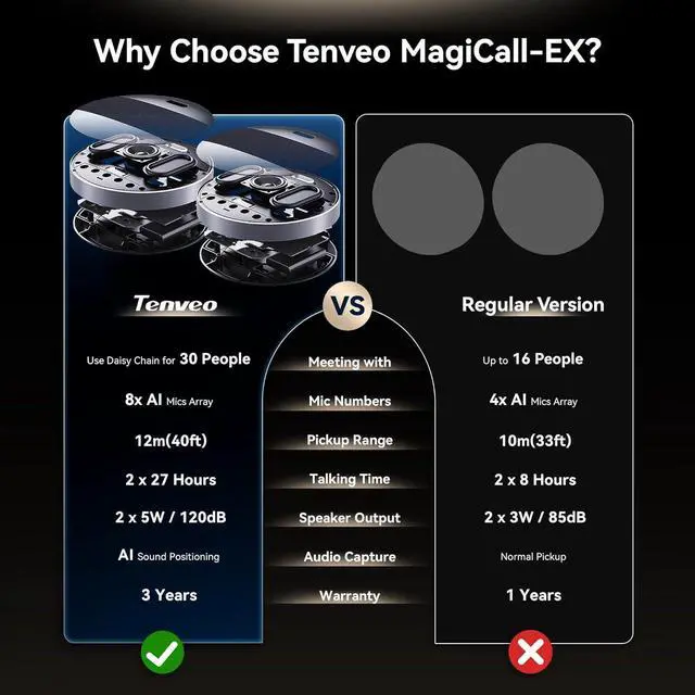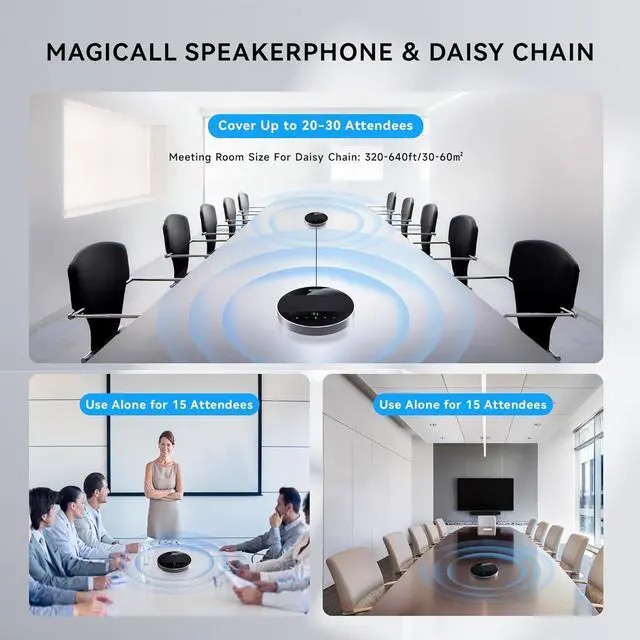 Daisy Chain/Use Alone Ideal for Medium/Large MeetingTenveo MagiCall-EX Bluetooth Conference Speakerphone features daisy chain function, cascading 2 conference speakers greatly expand your effective meeting space, delivering superb audio for collaborative conference, supporting meetings of up to 30 attendees. Meanwhile, you can not only take MagiCall-EX to a larger meeting, letting more attendees participate in the conference call, but use alone for 2 small rooms as two MagiCall speakers.