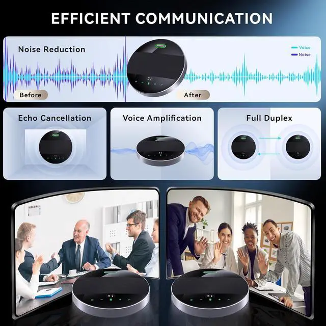 Outstanding Sound QualityThe Tenveo MagiCall-EX Conference Speakerphone is embedded with DSP audio processor and high-fidelity speaker and is equipped with intelligent environmental noise-reduction technology, it can capture the key content of the meeting and effectively filters surrounding noise. The built-in echo cancellation automatically improves sound clarity. Meanwhile, the bluetooth speakerphone uses on-screen touch buttons to keep it compact and stylish.