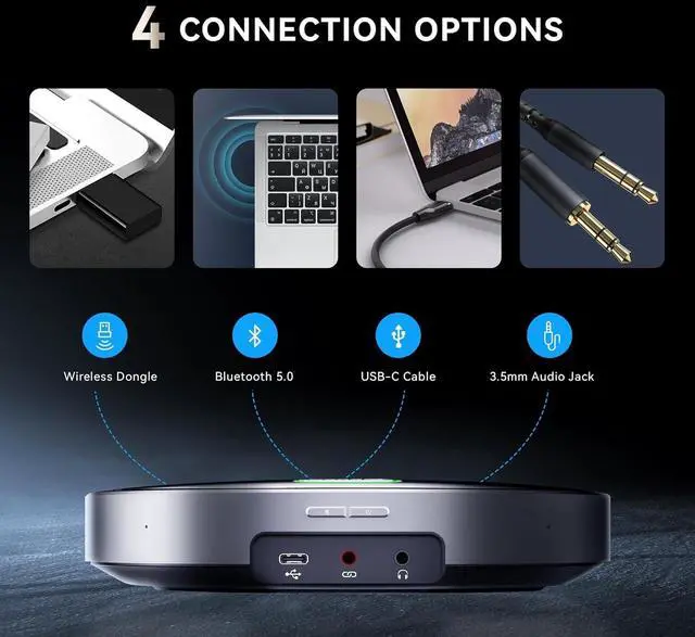 Professional omnidirectional Conference SpeakerphoneThe Bluetooth Conference Microphone has an omnidirectional pickup pattern with a pickup distance of 40ft/12m, making it easy to capture the most subtle sounds from 360° directions and transmit the sound more loud and clear. Built-in 2*4x Analog Silicon Mics Array to ensure that everyone within coverage can be heard clearly from any angle. With Ultra-clear Sound & Human Voice Localization function, providing a super fluent call experience.