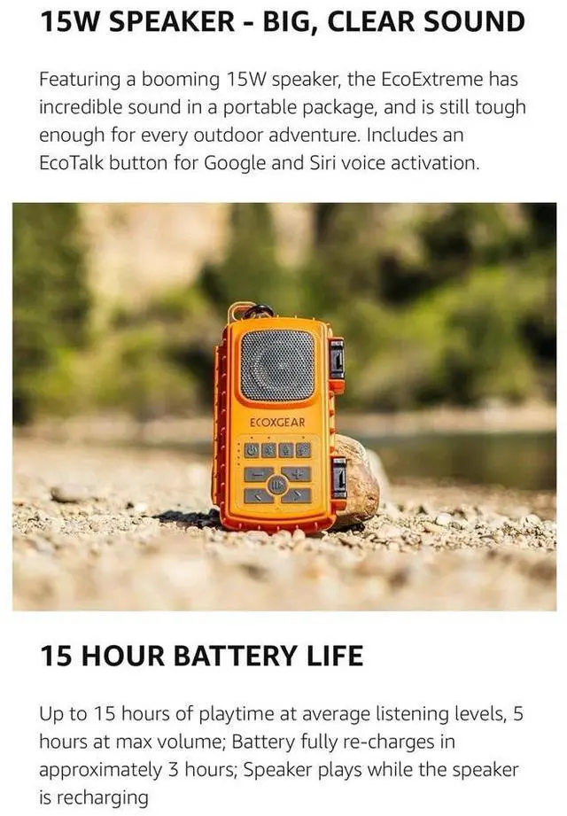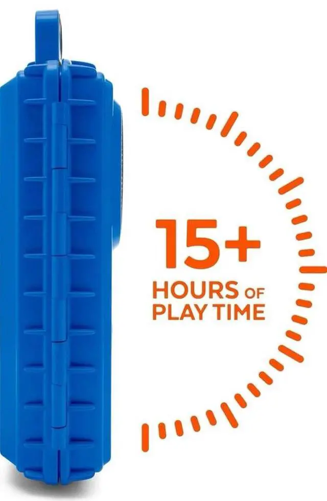BATTERY LASTS FOR HOURS - up to 15 hours of playtime at average listening levels, 5 hours at max volume; Battery fully re-charges in approximately 3 hours; Speaker plays while the speaker is recharging