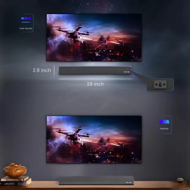 Easy To Use & Stylish Design- BESTISAN SE05P home theater audio supports multiple wireless and wired connections, you can quickly connect to your player. Besides, there is a light guide for connections and equalizer modes on soundbar to help you know the usage status timely. With stylish design, you can choose to place the soundbar directly on the table, stand, cabinet or mount it on a wall to save your space according to your home decoration style and personal preferences.