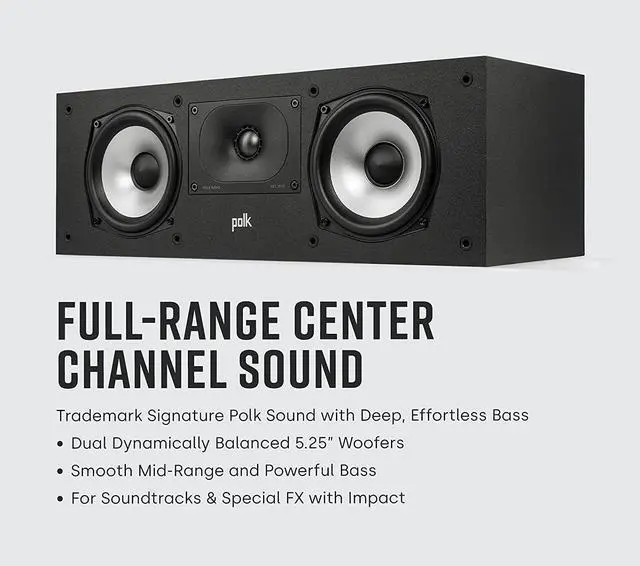 COMPACT CENTER CHANNEL SPEAKER - Enjoy focused, crystal-clear dialogues and dynamic, hi-res sound with Polk Monitor XT30 that features a 1" Tweeter & (2) 5.25 " Dynamically Balanced Woofer for smooth mid-range and effortless bass in an immersive soundstage