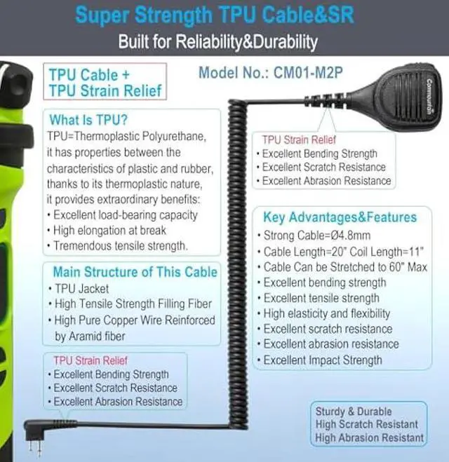 High Strength Precise Connector: With TPU (Thermoplastic polyurethane) rubber jacket, internal hard core and Nickel-plated brass plugs, assembled by precise soldering technology and molding technology, the connector of this speaker mic is built for stable connectivity and excellent operating life.