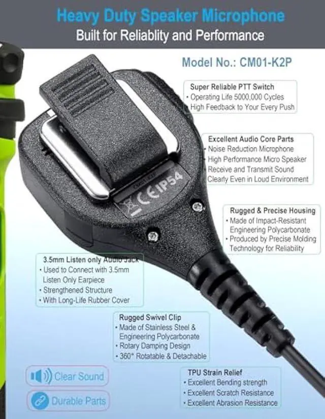 Rugged Construction: With high impact-resistant engineering Polycarbonate plastic housing, SMT electronic board, internal vibration absorption system, stainless steel detachable 360-degree rotatable heavy duty clip, combined with precise molding technology, this speaker microphone is built for tough mission critical use and is built to withstand knocks and bumps.