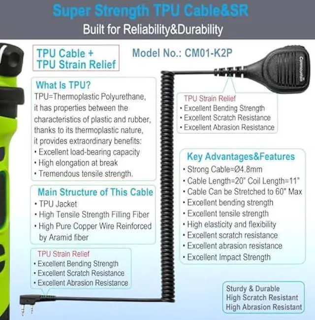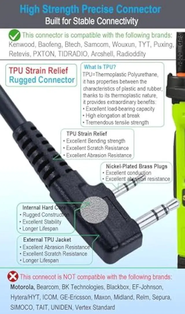 High Strength Precise Connector: With TPU (Thermoplastic polyurethane) rubber jacket, internal hard core and Nickel-plated brass plugs, assembled by precise soldering technology and molding technology, the connector of this speaker mic is built for stable connectivity and excellent operating life.