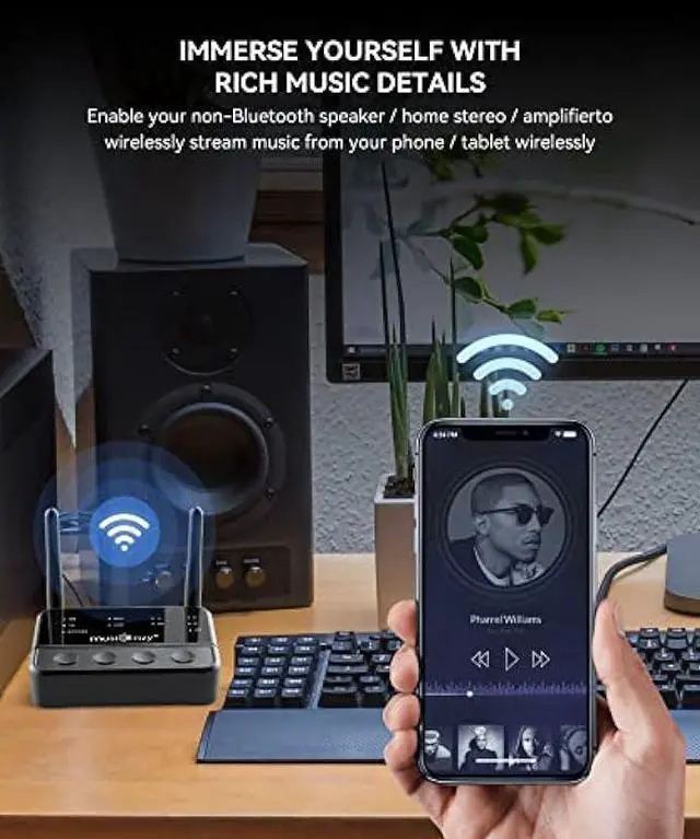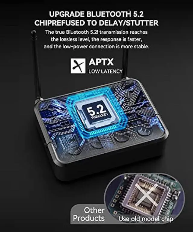 Upgrade Bluetooth Transmitter/Receiver MUSICOZY Bluetooth transmitter receiver adapter adopts the most high-end chip Bluetooth 5.2, with high fidelity stereo sound. The Bluetooth adapter let you can output music to your sound system or TV, MP3, CD player, PC or eBook from any phone, tablet, laptop, desktop, Bluetooth-enabled headphones, speaker or receiver. You can watch movies while listening to wireless audio in a synchronized fashion and without any noticeable audio delay.