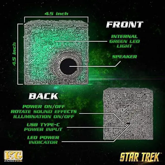 The STAR TREK Borg Cube battle-type vessel delivers a powerful music experience in a show-accurate model. We take pride in our attention to cosmetic detail, great sound quality, and fun features. This dreadnought sits as a focal point in any collection, office, or living space. A must-have collectible for Star Trek fans looking for a practical experience.
