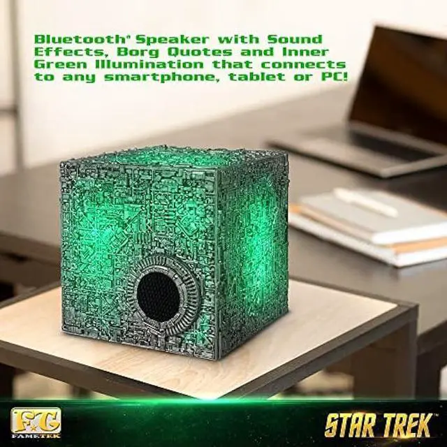 The FAMETEK STAR TREK Borg Cube Bluetooth Speaker with sound effects and quotes connects to any smartphone, tablet or PC. It helps you concentrate at work or pump up your exercise routine by cranking out your favorite music via Bluetooth.