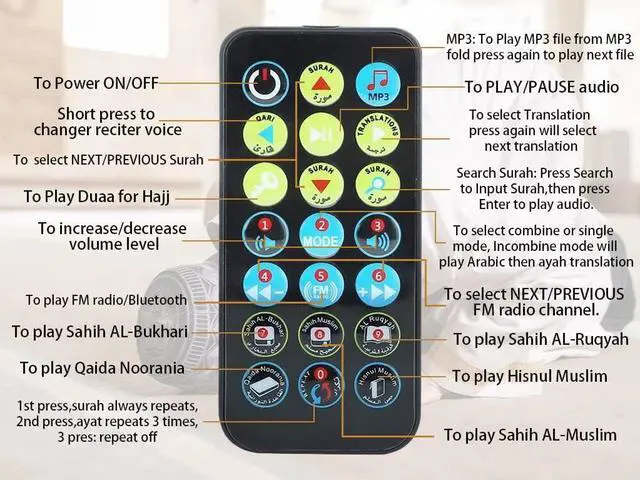 Quran: Portable Digital Quran Speaker includes 18 famous different reciters and 15 translation languages. Quran Speaker with remote control are ideal for learning the Quran.