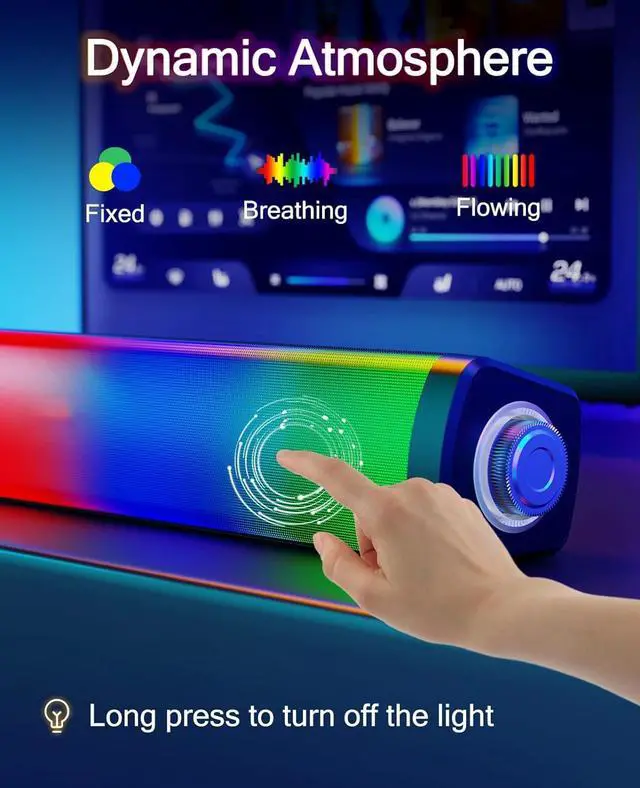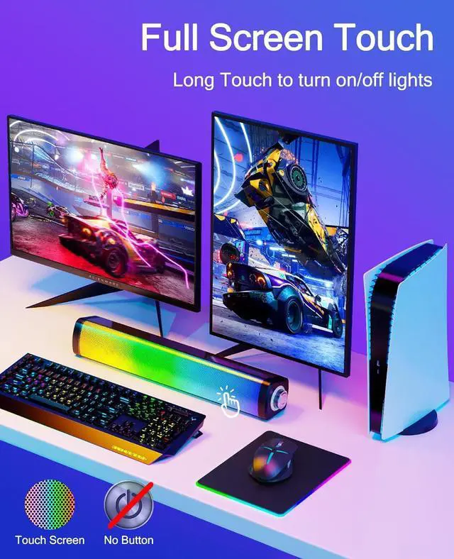 Touch Colored Lights: Simply touch the computer speaker grill anywhere can switch light modes. Increase the game or music atmosphere. Long touch the speaker grill to turn on/off lights easily.