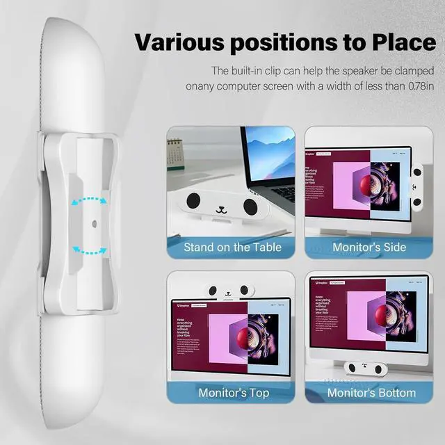 Easy Clip to MonitorTo maximize your desktop space, we designed a spring-loaded clip on the bottom of the speaker that opens manually and merges automatically, making it easy to clip the speaker to the top, sides and bottom of your monitor. Of course, you can also leave the speaker standing smoothly on a desktop. The maximum size of the clip opening is 0.78 inches, which makes it easy to clip the speaker to most monitors on the market!