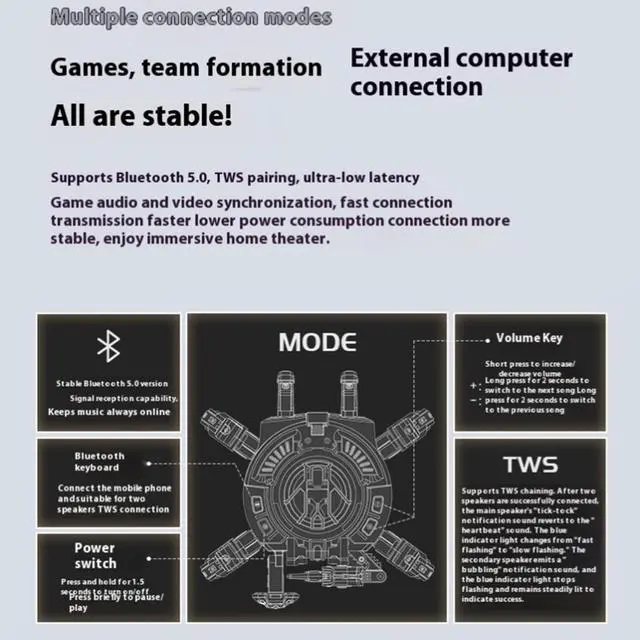 2. Bluetooth 5.0 chip for fast and stable connection within 10 meters, supports multiple devices, and allows two devices to wirelessly sync stereo sound.