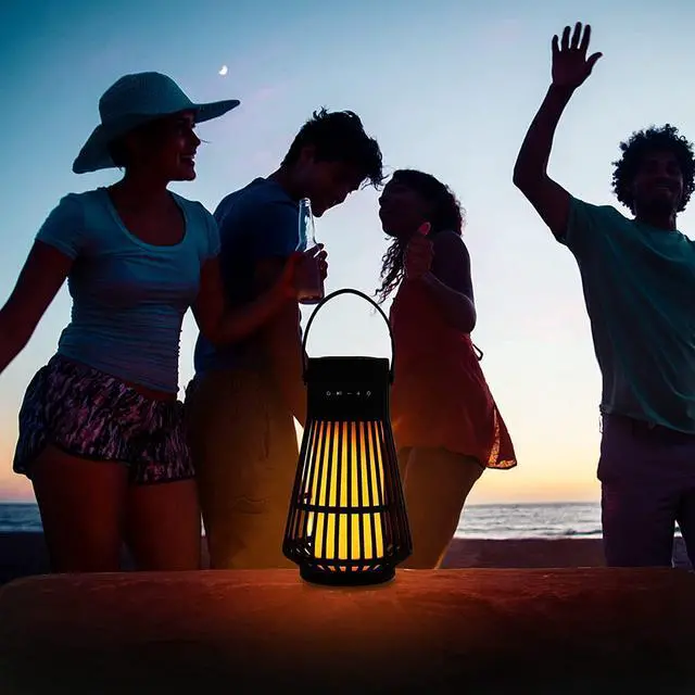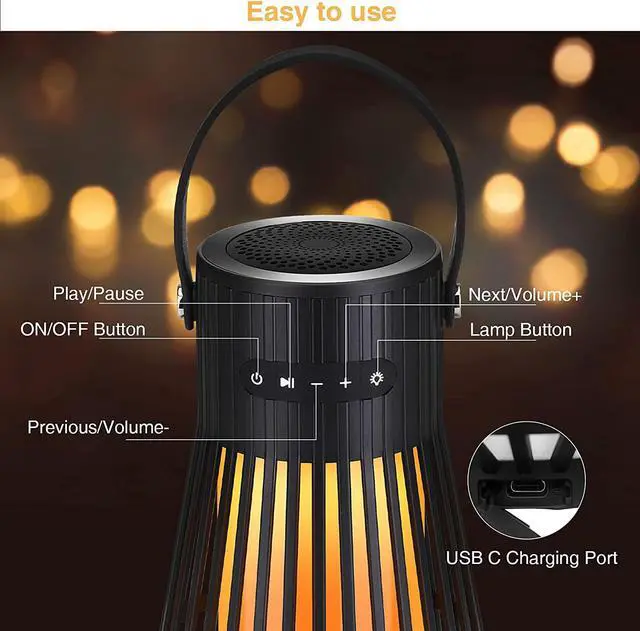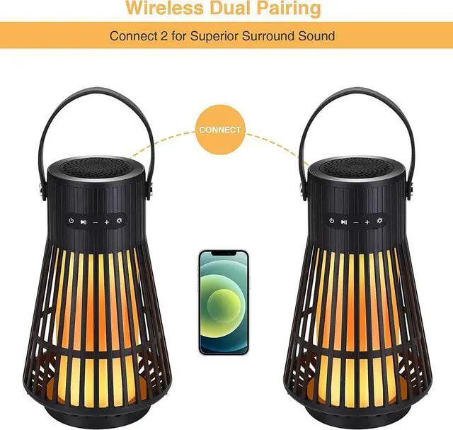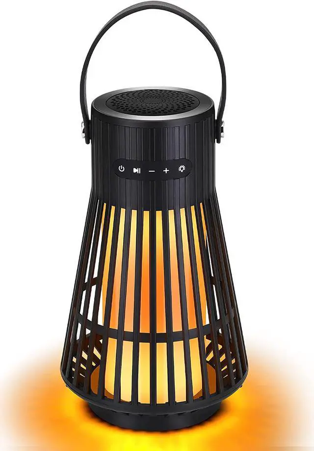 IN 1 flame ambiance speaker: The wireless LED speakers are not only speakers but also hanging lanterns, and night lights! Upgraded 120 LEDs torch flicker gorgeous dancing flames, not like other speakers only include 60, 96 LEDs, All 120 LEDs flicker together with warm yellow lights, forming a stunning flame, mimic extremely realistic & natural dancing flames, combined with great audio function, to create a romantic atmosphere for your yard, garden, party, and camping.